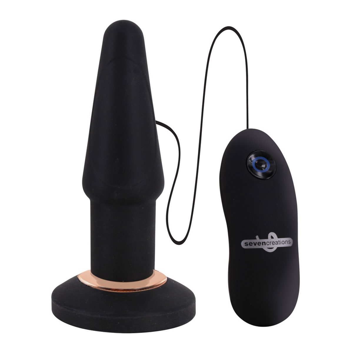 Ein schwarzer Analvibrator mit sieben Vibrationsmodi für Anal-Liebhaber gefällig? Der Vibrator in Plug-Form ist per kabelgebundener Fernbedienung steuerbar. Mit goldenem Ring. Jetzt kaufen.