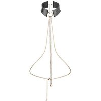 Dieses edle Stück ist mehr als nur ein edler Halsschmuck. Filigrane schwarze Metallplättchen schmiegen sich um deinen Hals und treffen vorne an der Kehle an einem goldenen Ring zusammen. Von diesem fallen goldene Kettchen herab, von denen eine wie ein Pendel dein Dekollete abmisst, während die andere deinen Brustkorb umfasst und damit an einen Harness erinnert. Wunderschön in Kombination mit den Désir Métallique Handfesseln, unter oder über einem transparenten Oberteil – oder als einziges Schmuckstück auf deinem nackten Körper für eine heiße Nacht allein zu zweit.