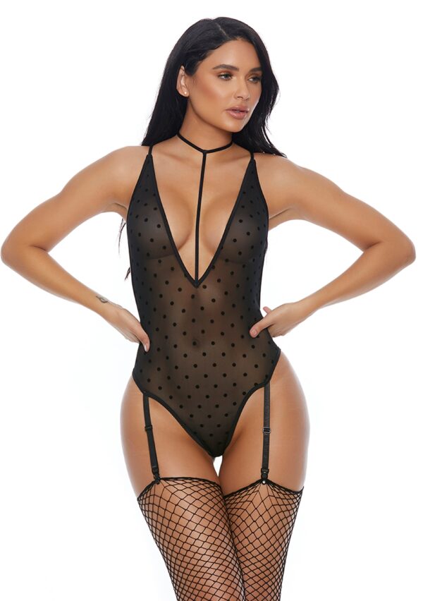 Sexy Body mit tiefem Ausschnitt und angesetzten Strumpfhaltern.. Eigenschaften:. – Material aus 90 % Nylon und 10 % Elasthan. – überkreuzter Rücken. – Halsband mit Riemchen. – Handwäsche empfohlen. – Einheitsgröße S-L