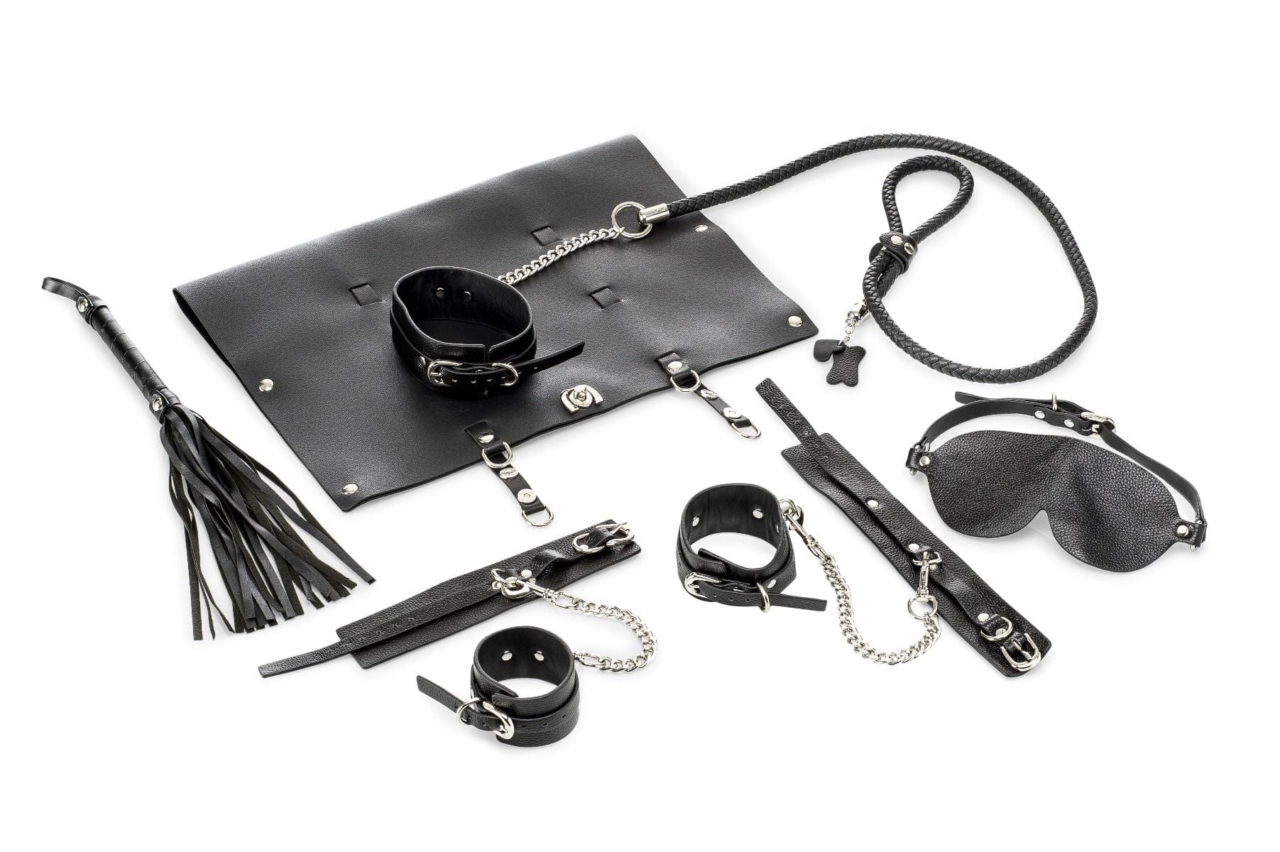 Dieses schwarze Bondage-Set ist für echte BDSM-Liebhaber.. Eigenschaften:. – Material aus Leder. – für interessante Spiele. – mit Peitsche (Gesamtlänge 44 cm). – Stränge 23 cm lang. – mit praktischer Tasche (Maße 30,5 x 42 cm). – inklusive Leine (120 cm lang). – mit Handschellen. – leicht verstellbar. – mit Augenbinde