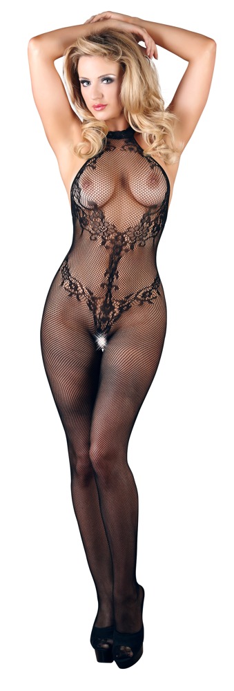 Catsuit ouvert, aus Netz, mit eingewebten Ornamenten in Spitzenoptik Schwarz