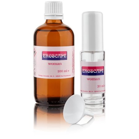 EROSCAPE WOMAN ist eine hochkonzentrierte, duftneutrale Pheromonlösung und enthält die wissenschaftlich getesteten, menschlichen Pheromone ” Androstenol ” sowie Kopuline . Die spezielle Zusammensetzung von EROSCAPE WOMAN erhöht Ihre erotisch-weibliche Ausstrahlungskraft, Ihre Attraktivität wird gesteigert. Männer fühlen sich von Ihnen angezogen und suchen Ihre Nähe. EROSCAPE WOMAN ist die ideale Flirthilfe für die Frau, das Geheimnis für Ihren privaten und beruflichen Erfolg! Was bekommen Sie: – eine 100 ml Nachfüllflasche – einen leeren 20 ml Sprühflakon – einen kleinen Trichter zum Nachfüllen Für Vielnutzer, die güstigste Variante: Sie sparen 69,00 Euro gegenüber den Tropfenflaschen! Ideal auch zur Verwendung mit unseren Duftanhängern . Du riechst so gut. Pheromone – Lockstoffe der Liebe Pheromone sind Sexuallockstoffe, die nicht nur bei Tieren sondern auch beim Menschen eine wichtige Rolle bei einer erfolgreichen Partner-findung spielen. Diese vorwiegend geruchlosen Botenstoffe werden durch ein winziges Organ ( vomeronasale Organ ) im Inneren unserer Nase aufgenommen und direkt zu den Wirk- zentren des Gehirns geleitet. Körperliche Reaktionen auf diese unbewußte Stimulation erfolgen prompt und messbar. Unzählige Versuchsreihen und wissenschaftliche Tests beweisen: der positiven Macht der Pheromone kann man sich nicht entziehen! Menschen, die die Pheromon-Geheimwaffe EROSCAPE für sich nutzen, verbessern ihre natürliche Ausstrahlungskraft. Sie werden von Ihrem Umfeld als eindeutig attraktiver, erotischer und erfolgreicher eingestuft. Ob privat oder im beruflichen Bereich, EROSCAPE Pheromone helfen Ihnen Ihre positiven Wirkung und Ihre persönlichen Erfolge zu optimieren. Stehen Sie im Mittelpunkt geheimer Sympathien, wie Sie es sich immer gewünscht haben ! Verwenden Sie EROSCAPE wie ein Parfüm und tragen Sie es auf Hals und Dekolletee auf. Schon wenige Tropfen bewirken eine deutliche Steigerung Ihrer Attraktivität. Durch wiederholtes Auftragen wird die postive Wirkung der Pheromone verstärkt. Ganz bewußt haben wir bei unseren puren Pheromonprodukten auf zusätzliche, “verräterische” Duftkomponenten verzichtet. So können Sie EROSCAPE mit Ihrem Parfüm problemlos mischen. Auch aufgrund der hohen Pheromonkonzentration ist dies durchaus möglich. Wir empfehlen ein Mischungverhältnis von 1:1. Ideal auch zur Verwendung mit unseren Duftanhängern .