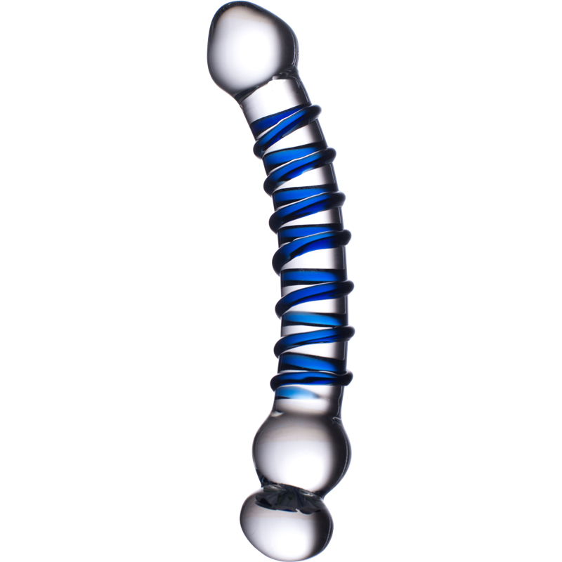 Eleganz und Ästhetik pur. Dieser wahre Liebeskünstler in transparentem Glas können Sie beidseitig benutzen. An dem einen Ende erwartet Sie eine dem Peniskopf nachempfundene Kugel. Der Schaft ist mit einer blauen Reizspirale überzogen. Am anderen Ende erwarten Sie zwei Kugeln, wobei in der obersten Kugel eine blau / weiße Blüte eingearbeitet wurde.