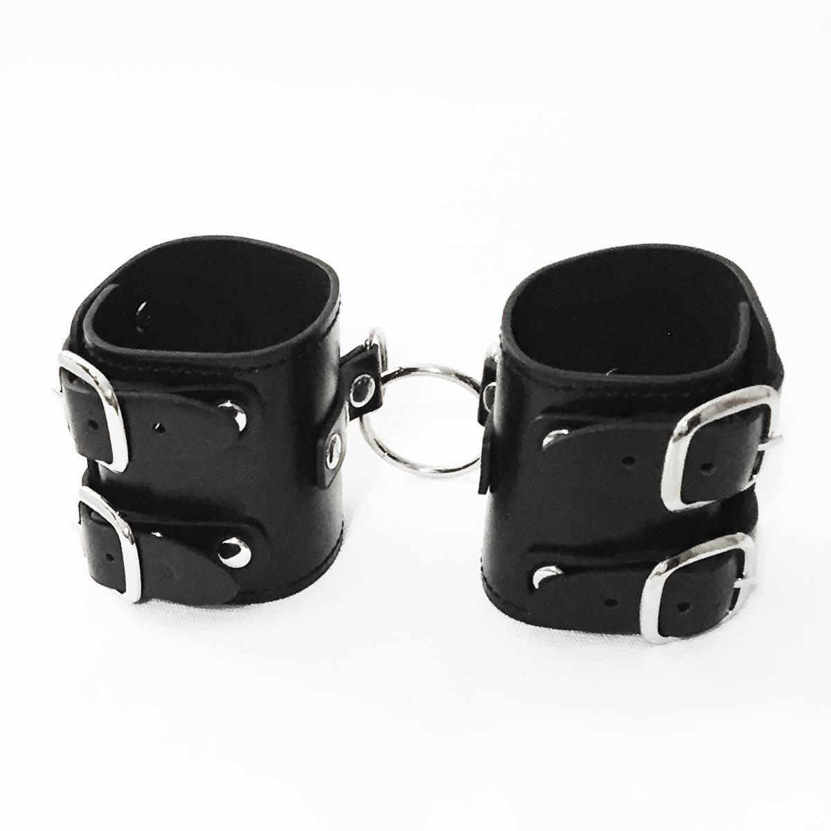 Diese Handgelenk Fesseln mit Doppelriemen überzeugen durch ihr schlichtes Leder-Design mit flachen Metallnieten. Die Manschetten sind mit einem Metallring verbunden. Jetzt bestellen.