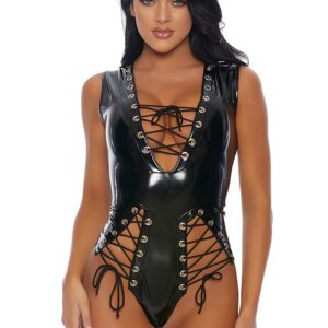 Das zweiteilige Dessous-Set hat Ösen zum Schnüren und geformte Körbchen.. Eigenschaften:. – Material aus 80 % Nylon und 20 % Elasthan. – verstellbare Träger. – veganes Leder. – Handwäsche empfohlen. – mit passendem Höschen. – Einheitsgröße S-L