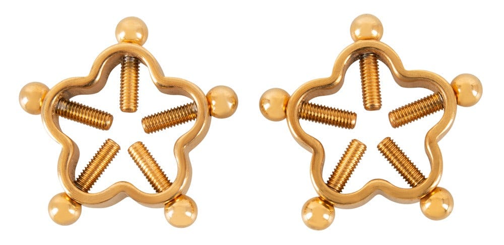 Süß schmerzender Brustschmuck ohne Piercen!. Diese beiden federleichten Nippelklemmen Nipple Jewellery Golden Flower von Bad Kitty halten die Brustwarzen durch jeweils 5 Justierschrauben sinnlich sanft bis erregend fest im Griff. Mit ihrem stylisch schlichten Blüten-Design sehen die goldfarbenen Metallklemmen sehr edel aus und machen die Illusion eines echten Piercings komplett.. 2 Stück.. Außen-Ø 2,3 cm, verstellbarer Innen-Ø 0,5 cm – 1,9 cm. Gewicht je 10 g.. Edelstahl.