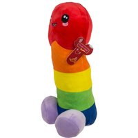 Knuddelpenis zum Kuscheln – Geschenk-Idee! Süßer bunter Plüsch-Penis in Regenbogenfarben. Mit aufgesticktem lächelndem Mund und Augen auf der Eichel. Steht bzw. sitzt auf seinen kugeligen Plüschhoden. Soft und flauschig fest befüllt mit samtweicher Oberfläche. 30 cm groß. 100% Polyester.