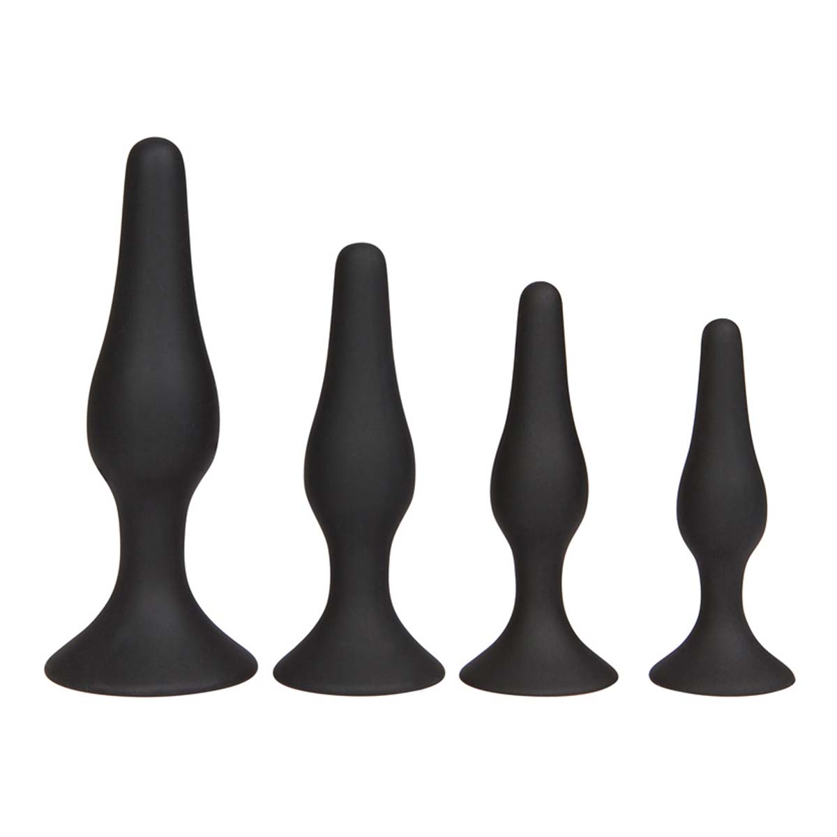 Silikon-Analplug Set in schwarz, bestehend aus vier Plugs in verschiedenen Größen. Hautfreundliches Material. Ideal für Anal-Training. Gleitfreudige, samtig weiche Oberfläche. Günstig bestellen.