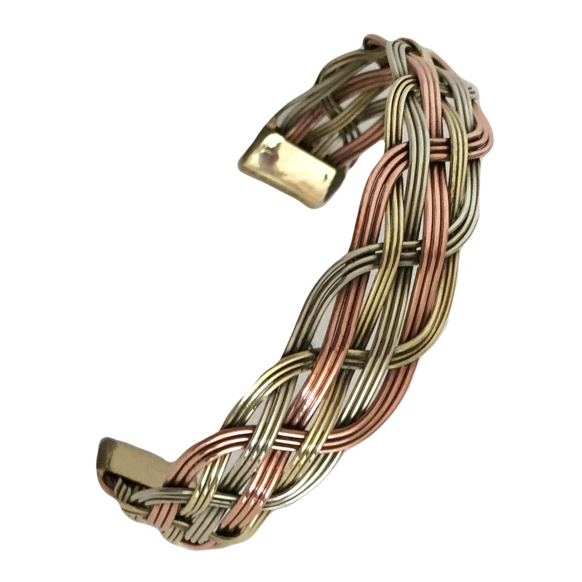 Die unwiderstehliche Armspange Shameela überzeugt durch ein glänzendes Geflecht in Gold- Silber- und Kupferfarben. Jetzt kaufen.